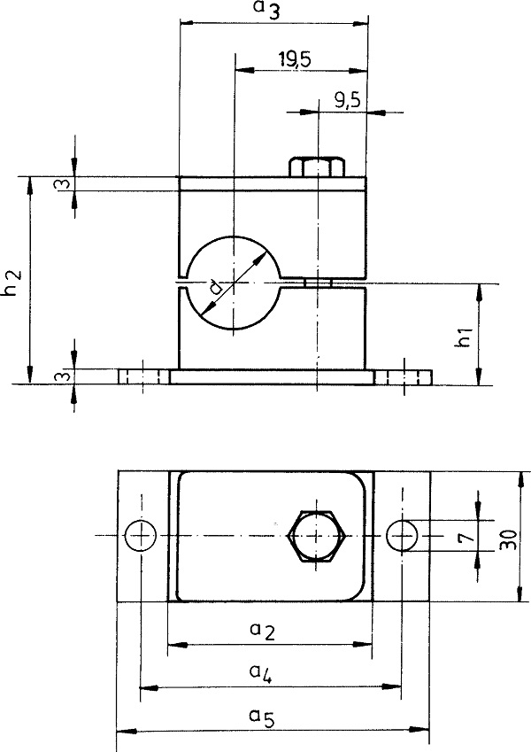 Rohrdurchmesser d = 8 mm a3 = 28 mm Höhe (ohne Grund- und Deckplatte) = 26 mm